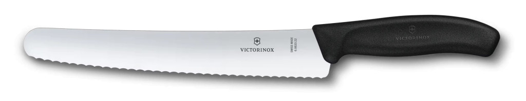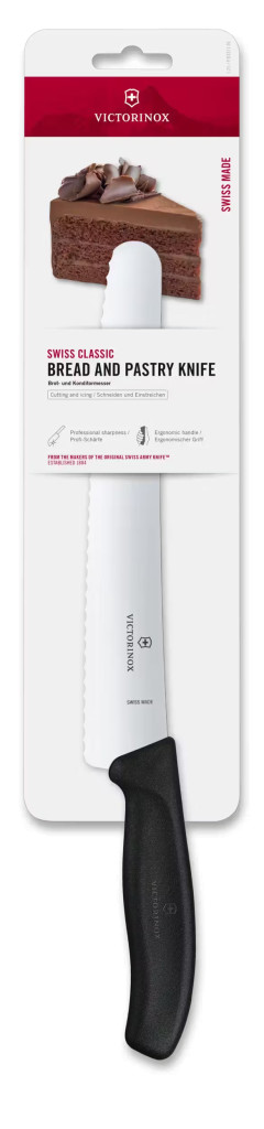 Éles kés kenyér és péksütemények szeleteléséhez. Ez a kenyér- és péksüteménykés professzionális, éles rozsdamentes acél pengével rendelkezik, amely recés élével könnyedén szeleteli a süteményeket. Könnyű, ergonomikus markolata kényelmes és biztos fogást garantál használat közben. Svájcban gyártott, mosogatógépben is tisztítható, tartós megbízhatóságra tervezve.