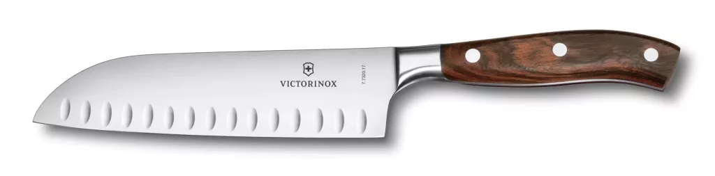 Santoku kés bordázott élű pengével. A gyönyörű formát és a kiváló funkcionalitást ötvöző Grand Maitre Santoku kés a Victorinox kovácsolt késsorozatából egyenletesen edzett, tökéletesen kiegyensúlyozott, full tang pengével rendelkezik. De nem csak ez a penge adja a Santoku késnek a robusztus erejét – a fa markolata is folytatja ezt a témát, elegáns és strapabíró egyaránt. Kézzel polírozott és ergonomikusan kialakított markolata kényelmes fogást és rendkívüli könnyű használatot ígér a felhasználónak, függetlenül attól, hogy mennyi ideig tart a használat. Ez egy kecses, sokoldalú kés, amelyet húsok, halak, gyümölcsök, zöldségek és sajtok precíz vágására terveztek, bordázott éle pedig minimálisra csökkenti az élelmiszerek pengéhez tapadásának esélyét. Otthoni és professzionális használatra egyaránt alkalmas.