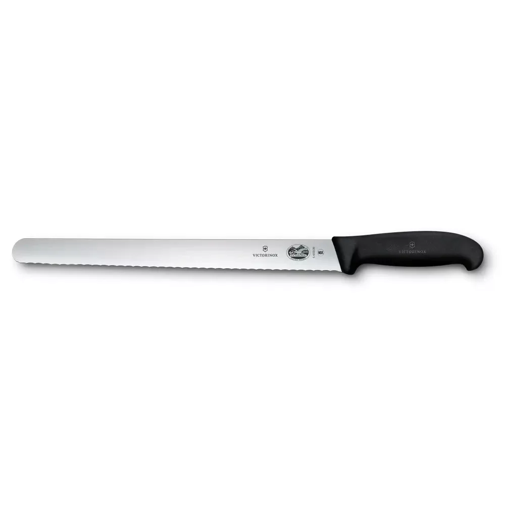 Sonkakés-szeletelőkés lekerekített hegyű, recés élű 30 cm hosszú pengével, fekete csúszásmentes markolattal.