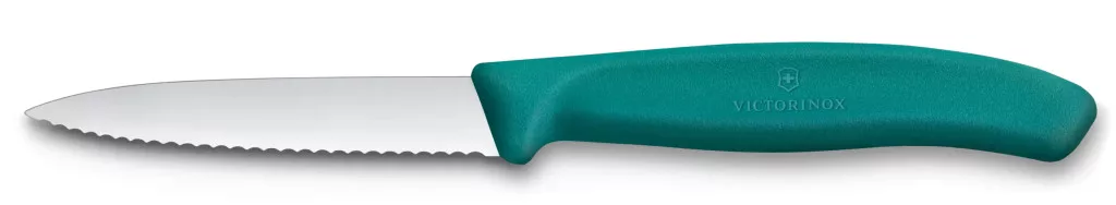 Recés élű és hegyes zöldségkés. Ez a kiskés professzionális, éles rozsdamentes acél pengével rendelkezik, recés élű és hegyes, így ideális számos precíz előkészítési feladathoz. Könnyű, ergonomikus markolata optimális kényelmet és irányítást biztosít. Svájcban gyártott, mosogatógépben is tisztítható, megbízható és hatékony a mindennapi konyhai használatban.