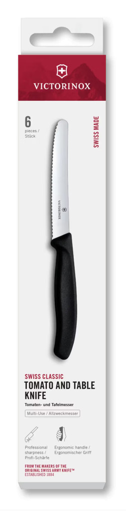 Késkészlet éles, recés élű pengékkel. Ez a paradicsom- és asztali késkészlet professzionális, éles, recés élű rozsdamentes acél pengékkel rendelkezik. Ideális számos precíz előkészítési feladathoz, és tökéletes vágást biztosít. Könnyű, ergonomikus markolata optimális kényelmet és irányítást biztosít. Svájcban gyártott, mosogatógépben mosható, megbízhatóságot és hatékonyságot biztosít a mindennapi konyhai használathoz.