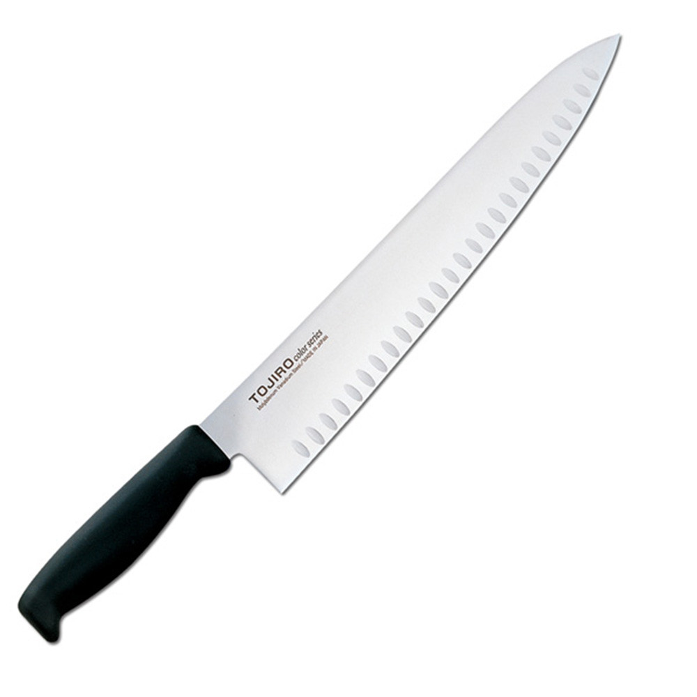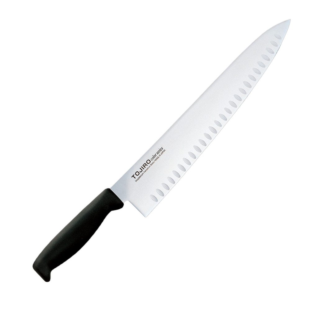 Tojiro Color Szakácskés 30 cm hosszú bordázott pengével és fekete markolattal.