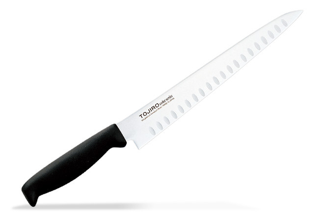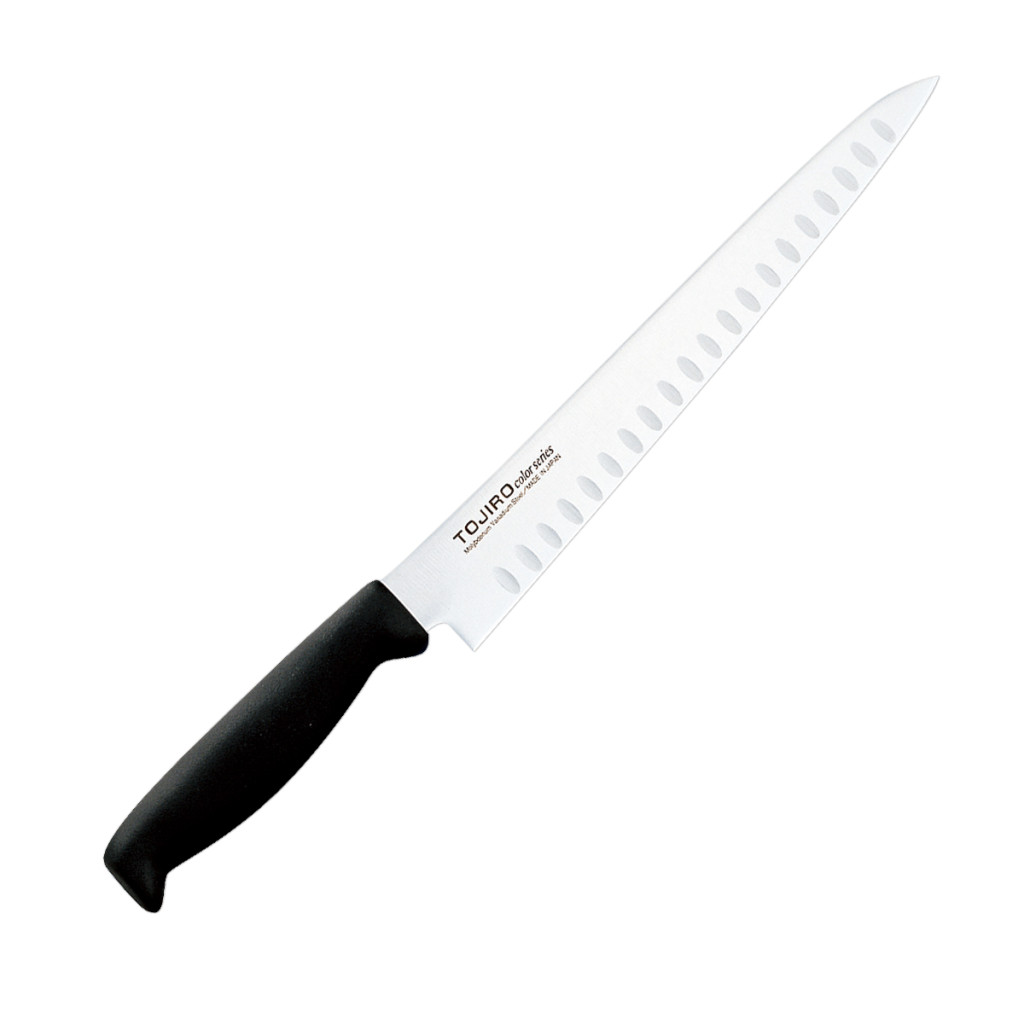 Tojiro Color Szeletelőkés 24 cm hosszú bordázott pengével és fekete markolattal.