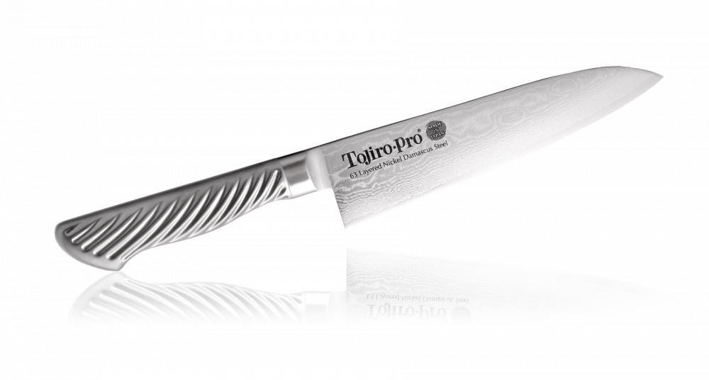 Tojiro Pro Nickel Damascus Szakácskés 18 cm hosszú damaszkacél pengével és rozsdamentes acél markolattal. Különböző nikkeltartalmú acélok kovácsolásával, elegáns fodros mintázat keletkezik, a szuperkemény acél sűrűsége és egységessége fokozódik, és végül maximális élességet eredményez. A markolat higiénikus, teljesen rozsdamentes acélból, amelynek „tornádó mintázata” megakadályozza a nedves vagy zsíros kéz elcsúszását.