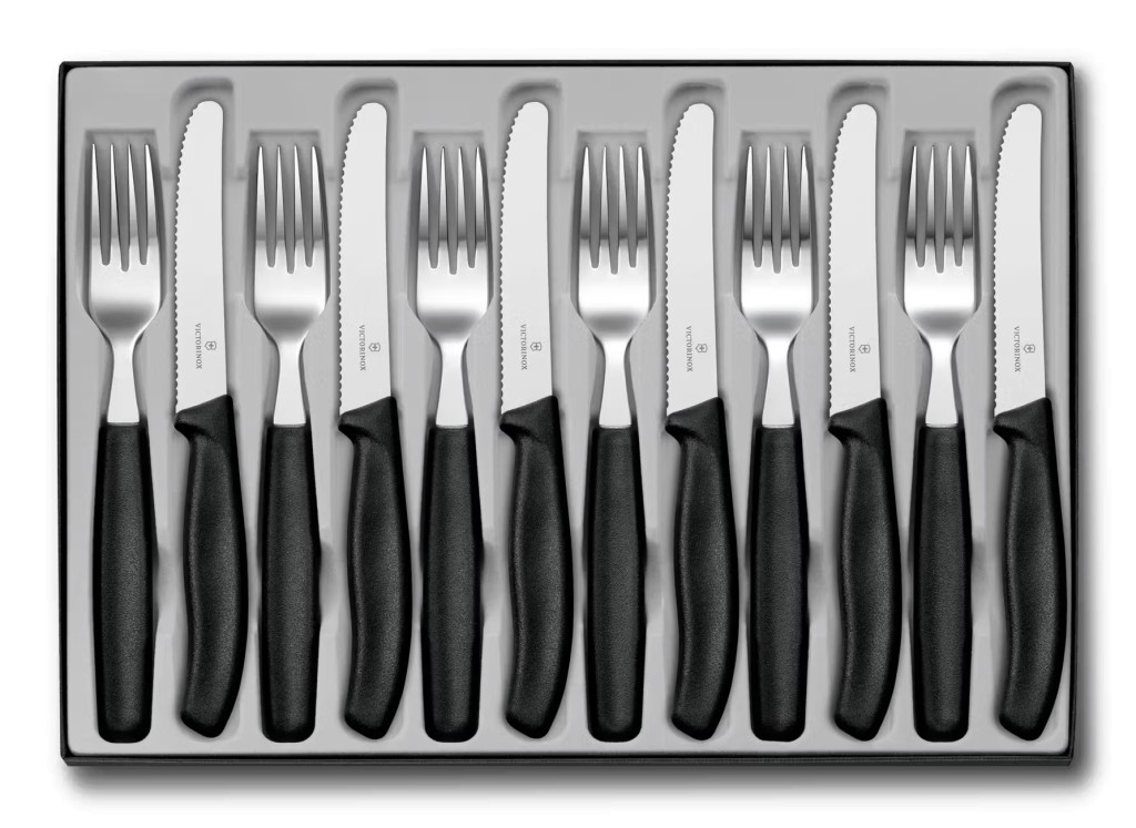 "A 6 villából és 6 késből álló készlet ergonómikus polipropilén markolattal és recés, legömbölyített hegyű, 11 cm-es pengéjű késekkel felszerelt rozsdamentes készlet igazi adu-ász minden háztartás számára. Legyen szó terítésről vendégeknek vagy csak egy hétköznapi, egyszerű reggeliről, ez a készlet bármikor megállja a helyét. Jellemzői: forma, funkció, tartósság. A kések élének köszönhetően reggelizőkésnek is beillik, vághatunk vele pár szelet kenyeret vagy kenhetünk vajat, de nem okoz gondot zöldséget vagy gyümölcsöt sem szeletelni vele, vagy a felvágottból vágni. A szett késeit ajánljuk tehát klasszikus vagy modern terítékhez, valamint általános konyhai használatra. Mosogatógép-biztos, azonban a késeket nem ajánljuk a gépbe tenni, mert a magas hőfok miatt a kések éle csorbulhat. Ajánlott langyos, mosószeres vízzel tisztítani. A készlet egy elegáns díszdobozban van, így tökéletes ajándéknak is."