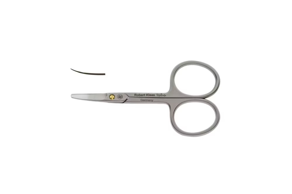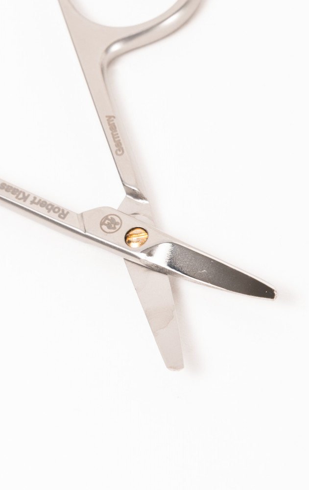 Robert Klaas Solingen Babakörömolló rozsdamentes acél, matt felülettel, lekerekített heggyel, aranyozott csavarral, 9 cm hosszúságú.