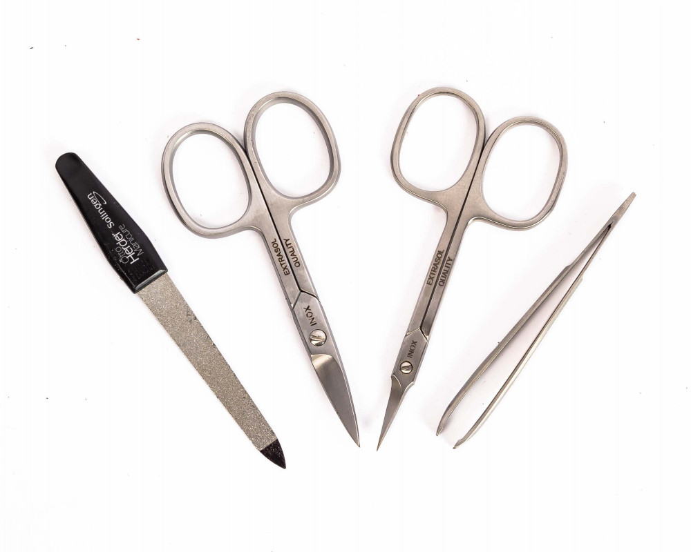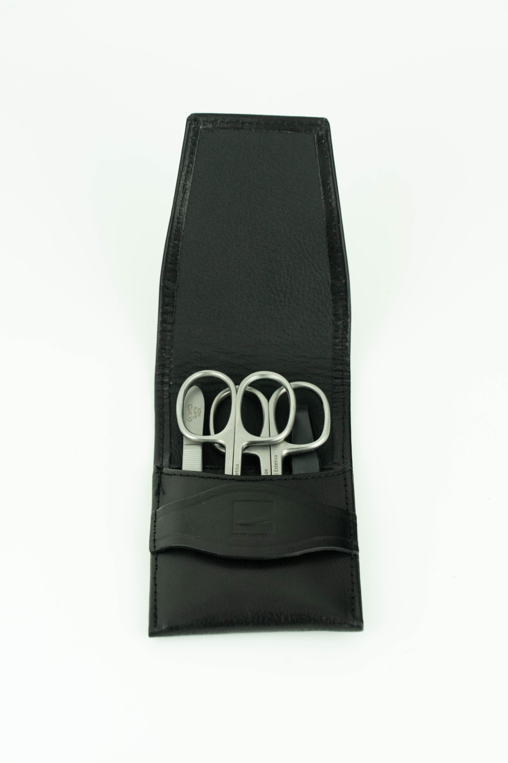 Exkluzív Kis Úti Manikűrkészlet 4 rozsdamentes acél eszközzel, fekete magyar kézműves bőrtokban.
