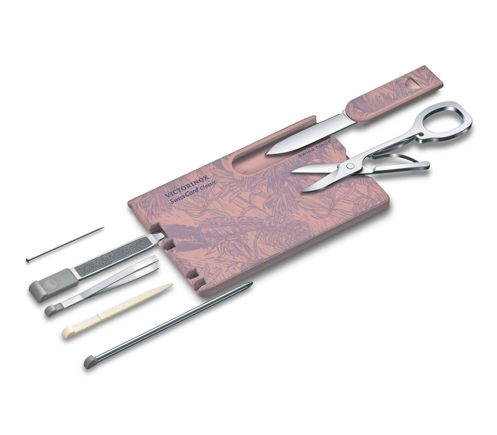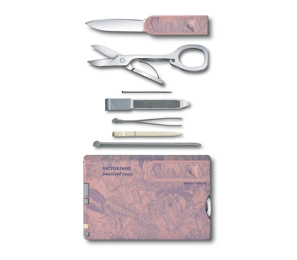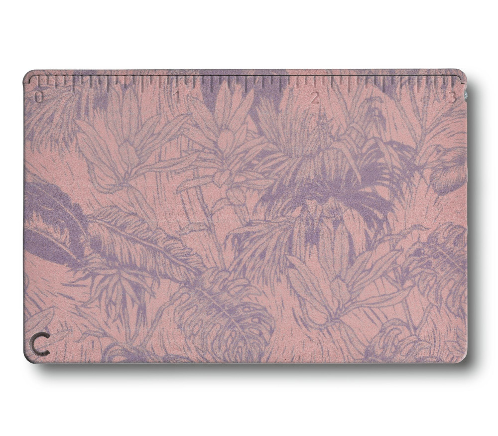 Lilás rózsaszín virágmintával díszített, egyedi kivitelben. 10 funkciós bankkártya méretű okoseszköz. Tartalmaz minden fontos körömápoló és mobilirodai eszközt, amire szüksége lehet: körömreszelőt, csipeszt, golyóstollat és levélnyitót is.